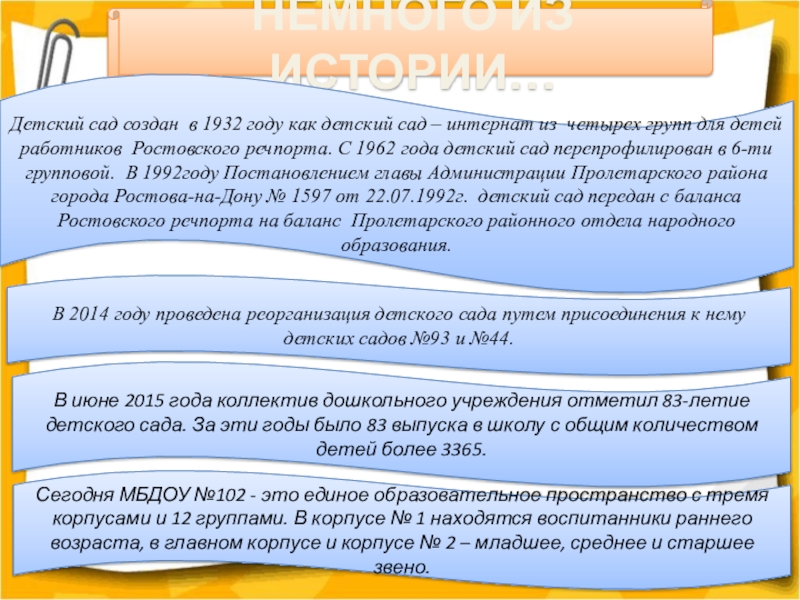 Сегодня МБДОУ №102 - это единое образовательное пространство с тремя корпусами и 12 группами. В корпусе № 1 находятся воспитанники раннего возраста, в главном корпусе и корпусе № 2 – младшее, среднее и старшее звено.