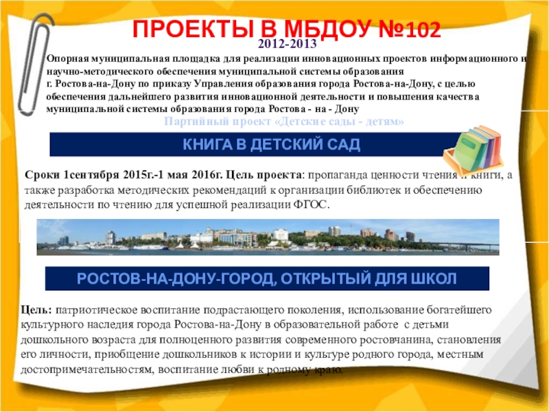 Цель: патриотическое воспитание подрастающего поколения, использование богатейшего культурного наследия города Ростова-на-Дону в образовательной работе с детьми дошкольного возраста для полноценного развития современного ростовчанина, становления его личности, приобщение дошкольников к истории и культуре родного города, местным достопримечательностям, воспитание любви к родному краю.
