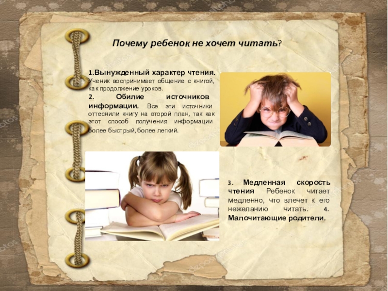 3. Медленная скорость чтения Ребенок читает медленно, что влечет к его нежеланию читать. 4. Малочитающие родители.