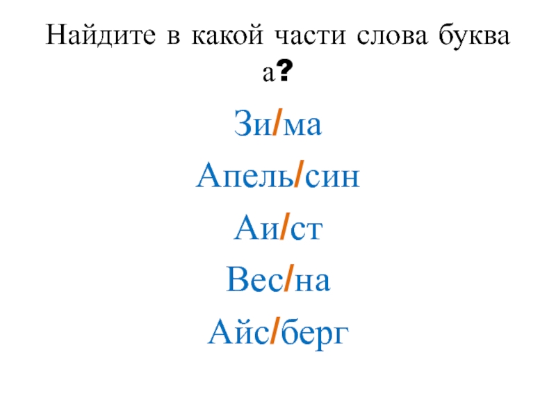 Найдите в какой части слова буква а?Зи/маАпель/синАи/стВес/наАйс/берг