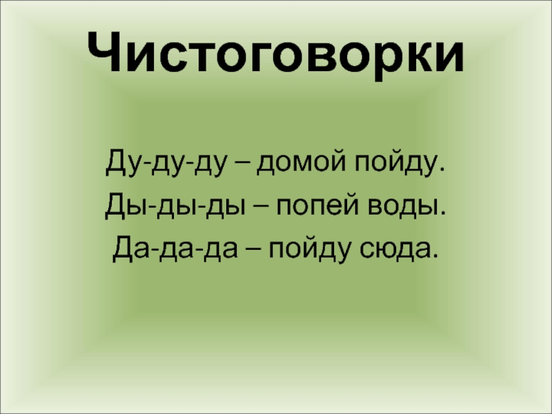 ЧистоговоркиДу-ду-ду – домой пойду.Ды-ды-ды – попей воды.Да-да-да – пойду сюда.