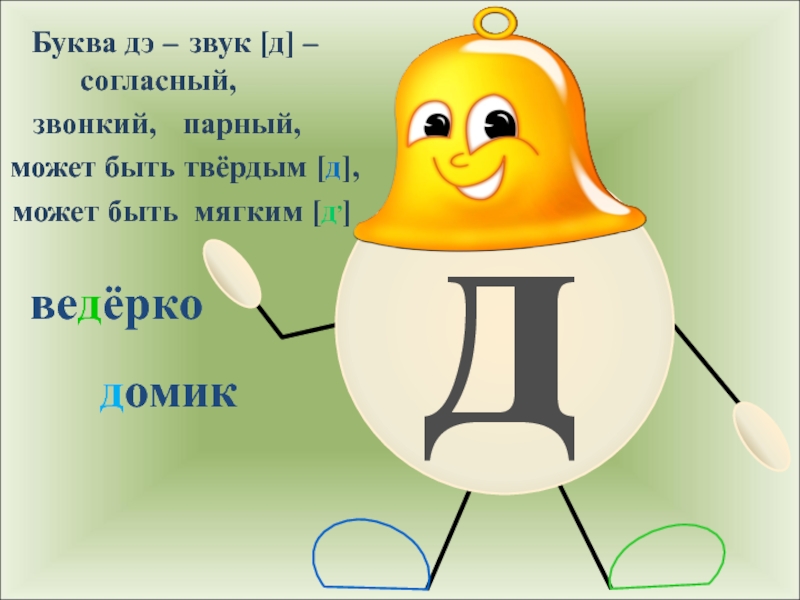 ддомикБуква дэ – звук [д] – согласный, звонкий, парный,может быть твёрдым [д],может быть мягким [д,]ведёрко