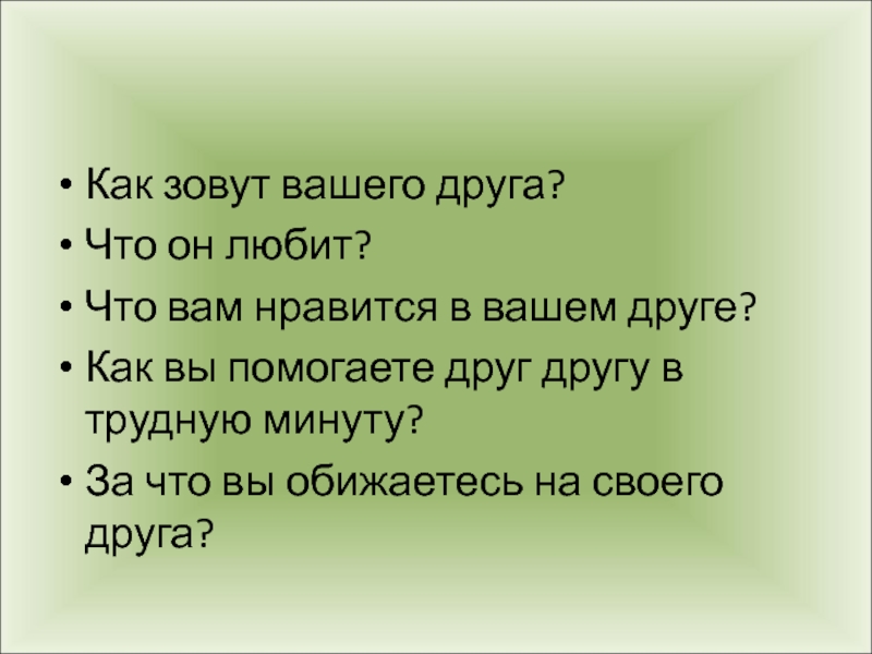 Как зовут вашего друга?Что он любит?Что вам нравится в вашем друге?Как вы помогаете друг другу в трудную