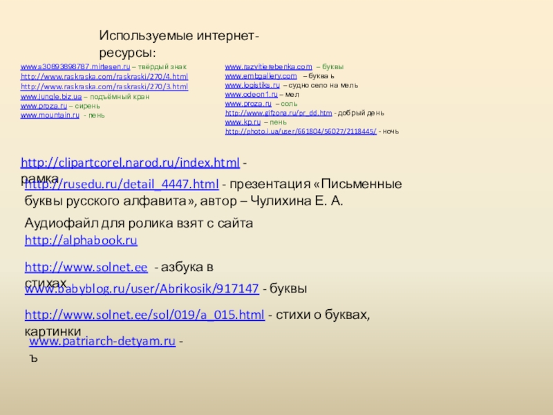 http://rusedu.ru/detail_4447.html - презентация «Письменные буквы русского алфавита», автор – Чулихина Е. А.