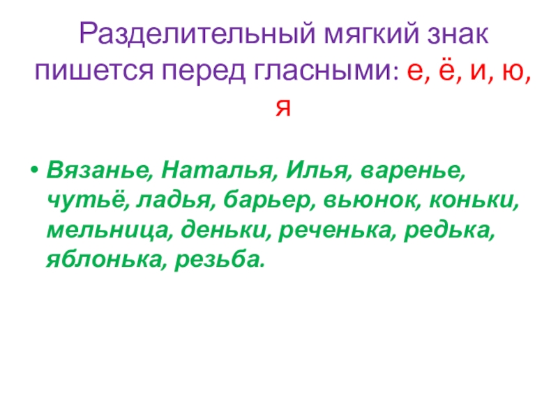 Вязанье, Наталья, Илья, варенье, чутьё, ладья, барьер, вьюнок, коньки, мельница, деньки, реченька, редька, яблонька, резьба.
