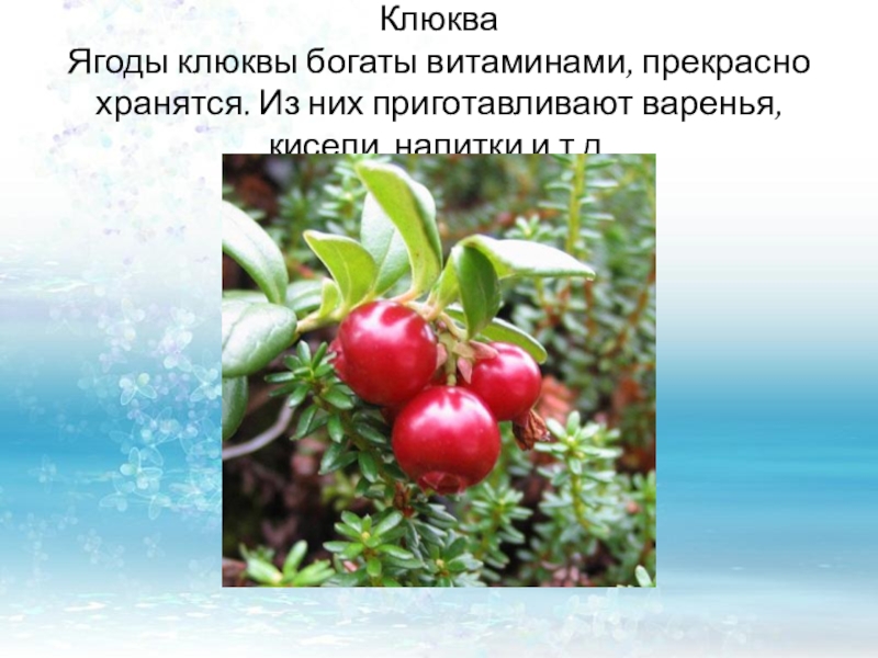 Ягоды клюквы богаты витаминами, прекрасно хранятся. Из них приготавливают варенья, кисели,