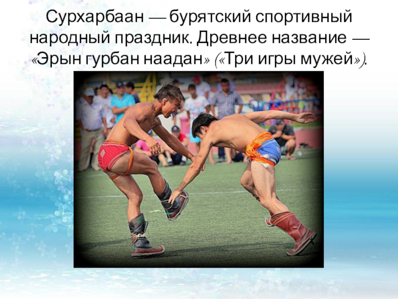 Слайд 33Сурхарбаан — бурятский спортивный народный праздник. Древнее название — «Эрын гурбан