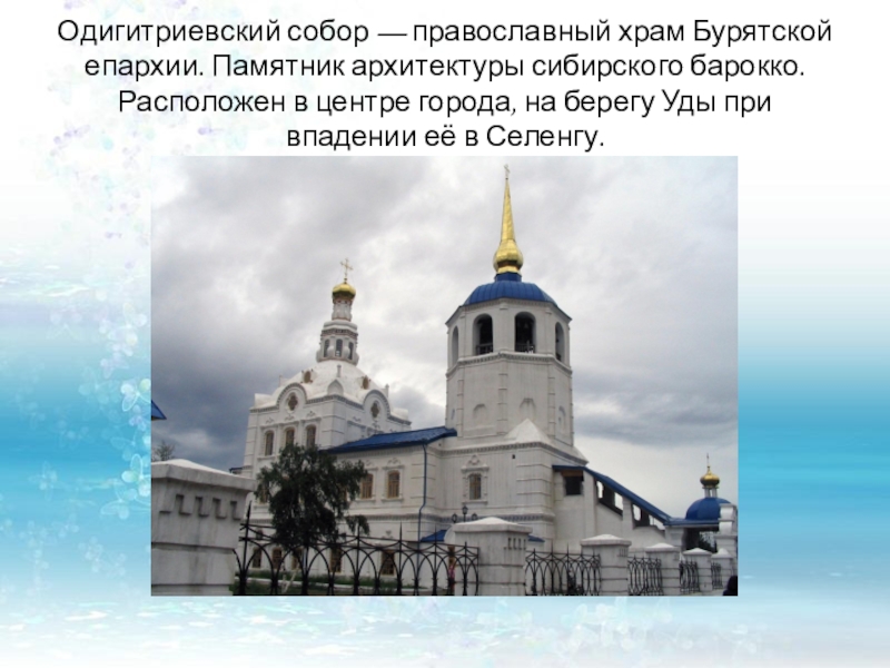 Слайд 27Одигитриевский собор — православный храм Бурятской епархии. Памятник архитектуры сибирского барокко.