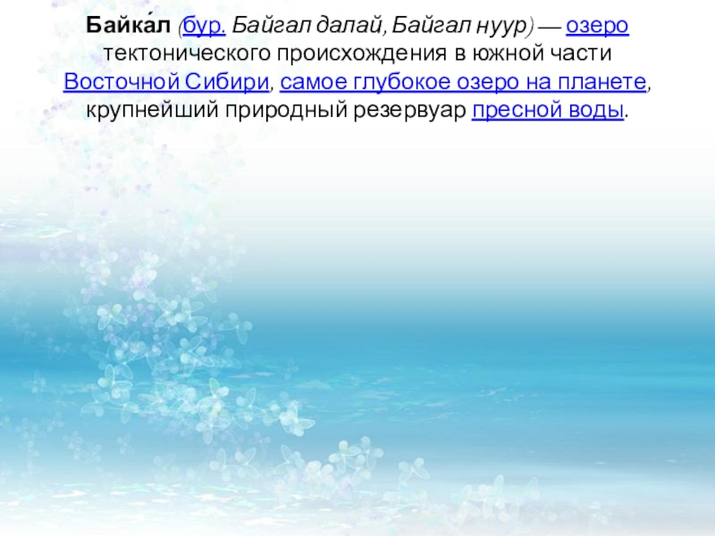 Слайд 7Байка́л (бур. Байгал далай, Байгал нуур) — озеро тектонического происхождения в южной части