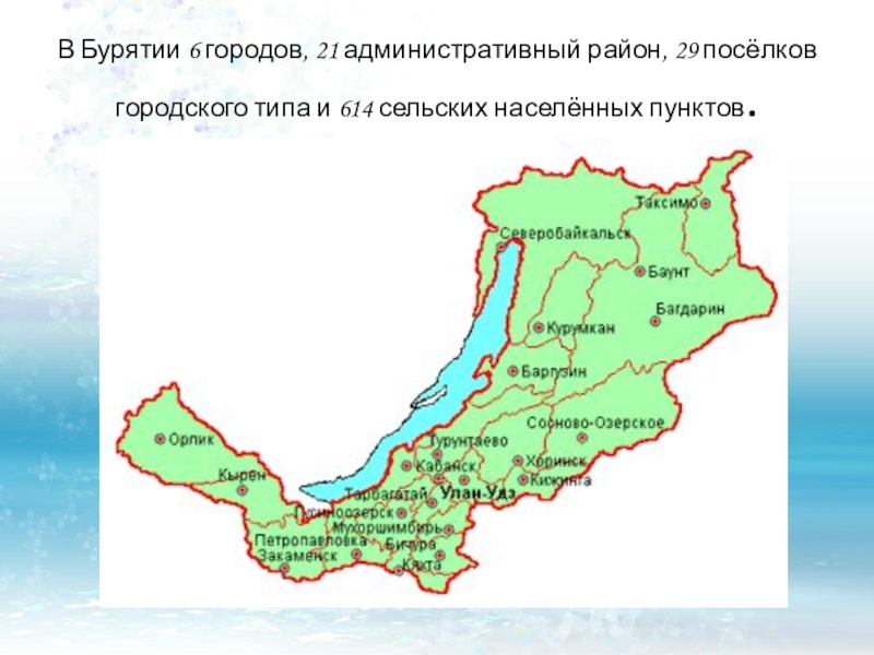 Слайд 6В Бурятии 6 городов, 21 административный район, 29 посёлков городского типа
