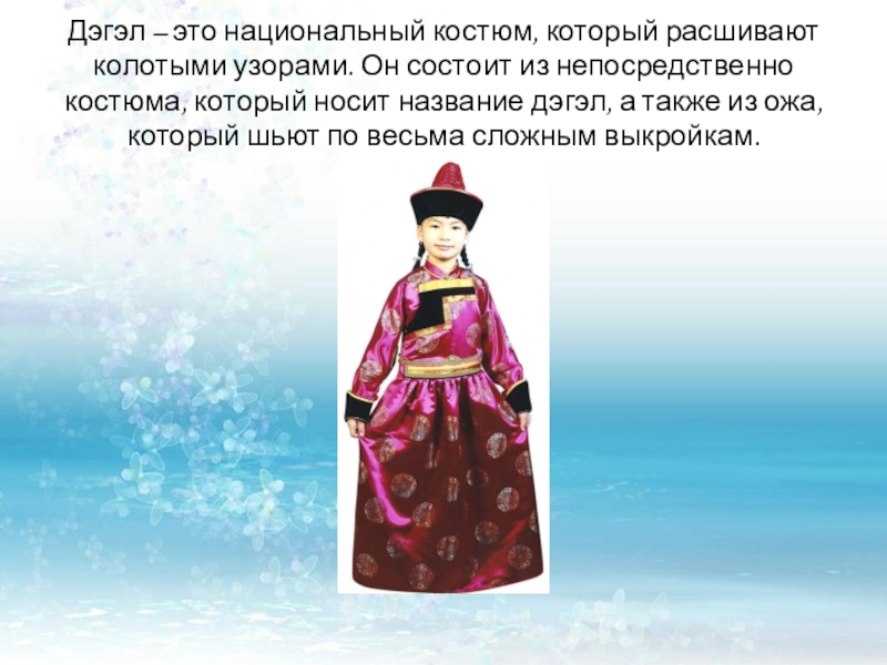 Слайд 36Дэгэл – это национальный костюм, который расшивают колотыми узорами. Он состоит