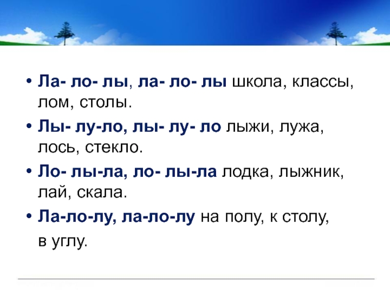 Ла- ло- лы, ла- ло- лы школа, классы, лом, столы.Лы- лу-ло, лы- лу- ло лыжи, лужа, лось,