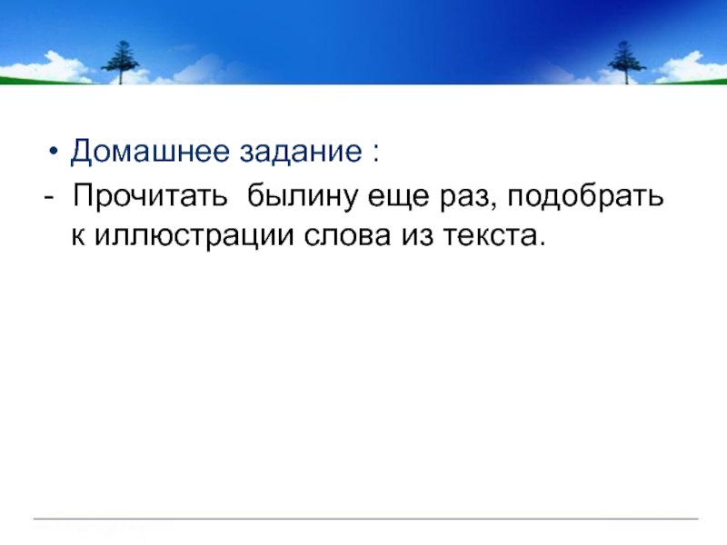Домашнее задание : - Прочитать былину еще раз, подобрать к иллюстрации слова из текста.