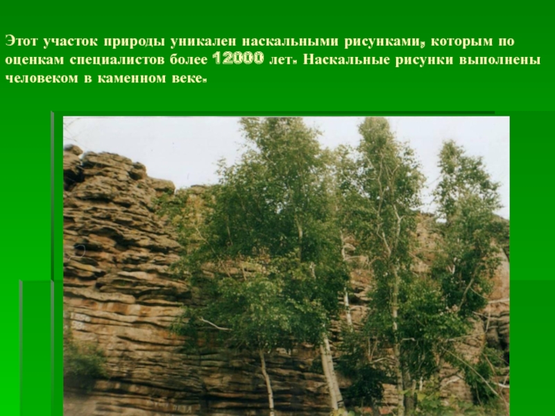 Слайд 4Этот участок природы уникален наскальными рисунками, которым по оценкам специалистов более
