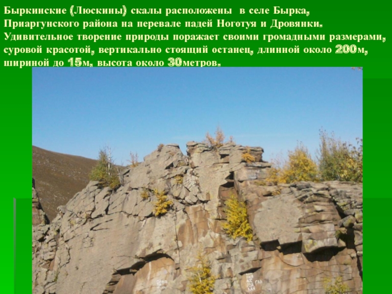 Слайд 2Быркинские (Люскины) скалы расположены в селе Бырка, Приаргунского района на перевале