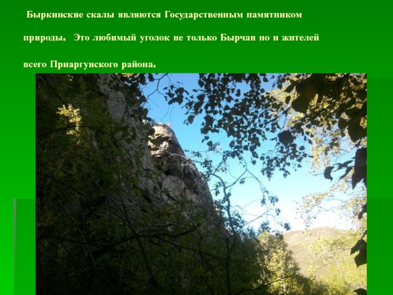 Слайд 8 Быркинские скалы являются Государственным памятником природы. Это любимый уголок не только