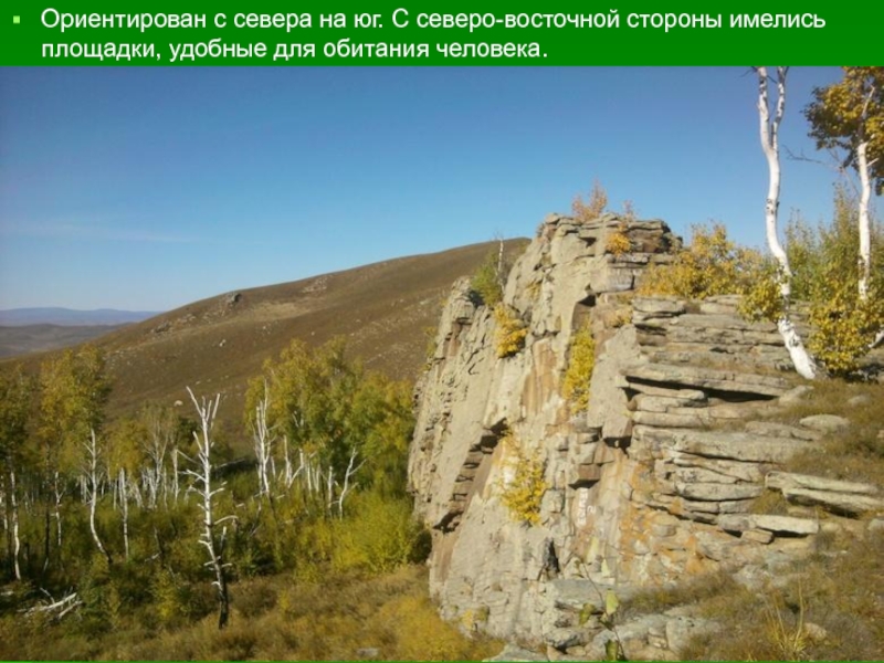 Слайд 3Ориентирован с севера на юг. С северо-восточной стороны имелись площадки, удобные
