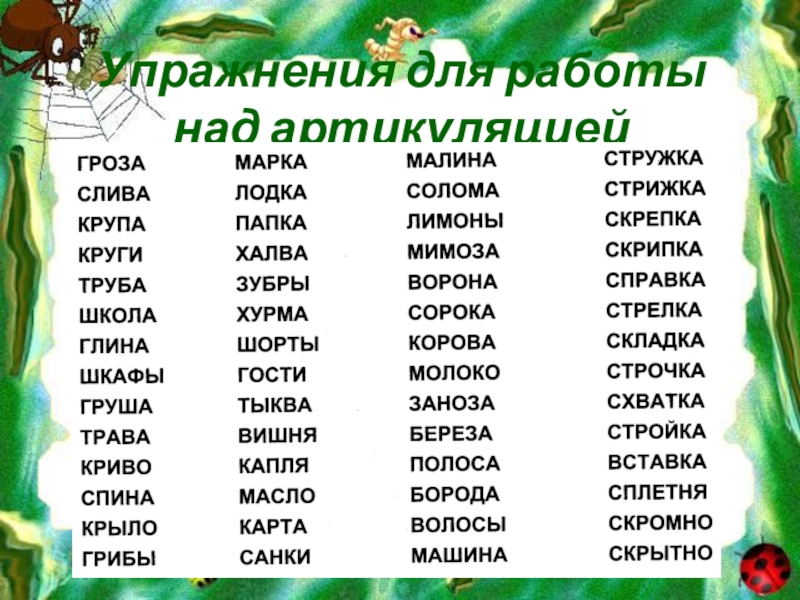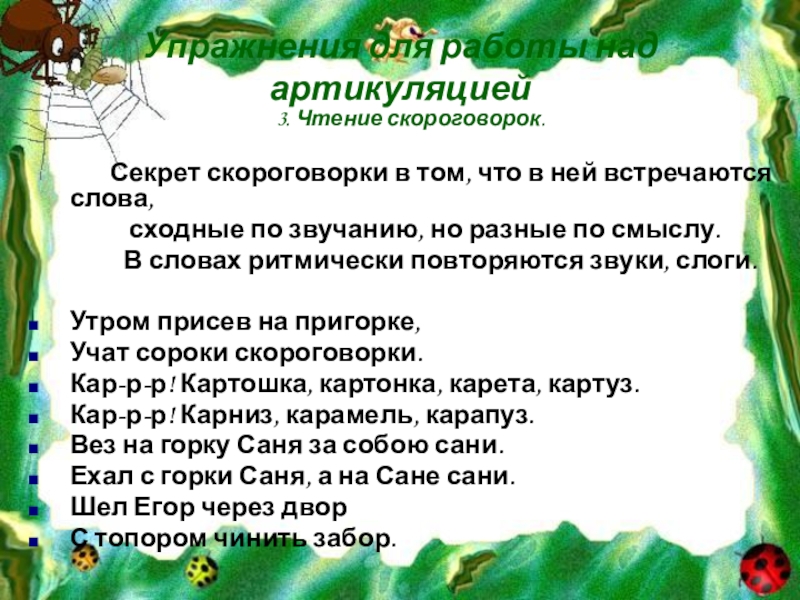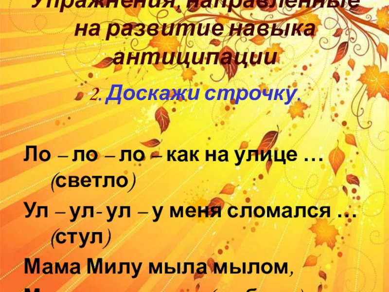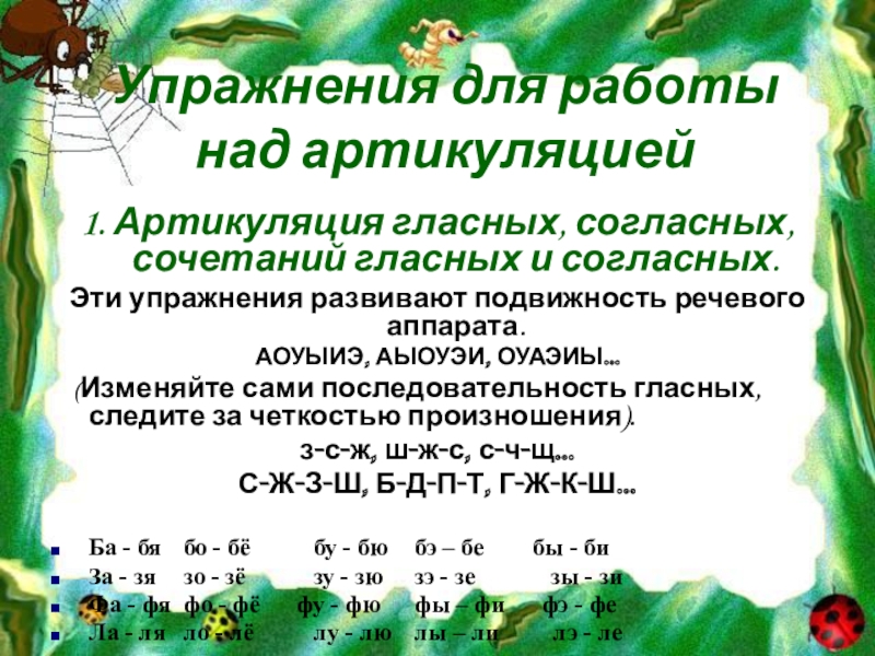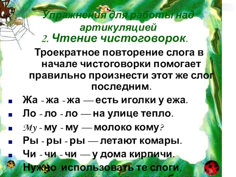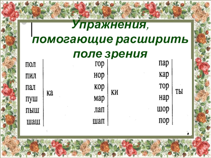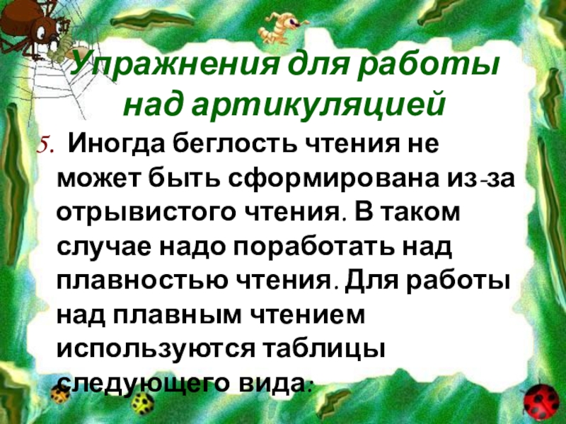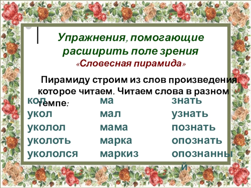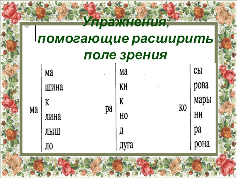 я кратко остановлюсь на каждой из этих причин и приведу примеры упражнений, помогающих устранить причины, тормозящие развитие и совершенствование технической составляющей процесса чтения.