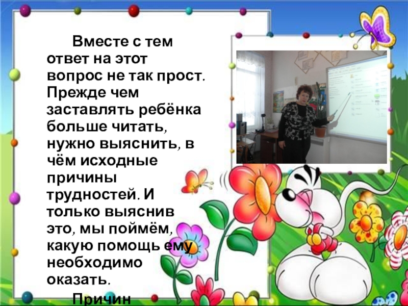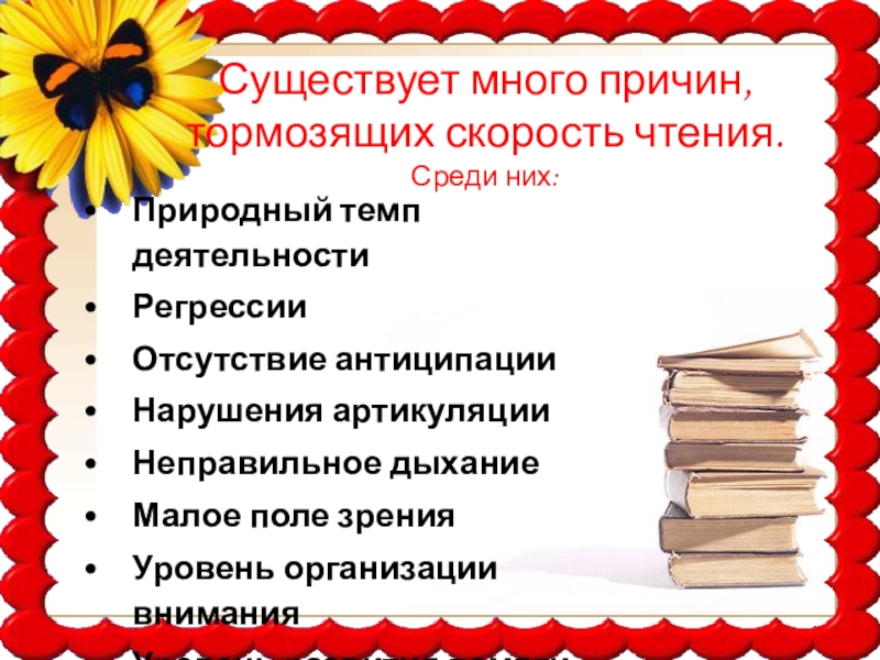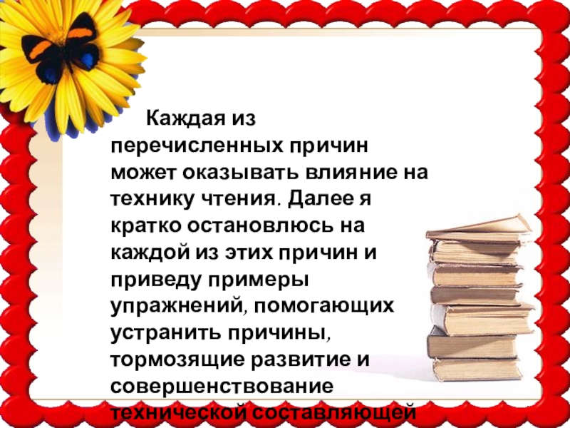 Слайд 16 Каждая из перечисленных причин может оказывать влияние на технику чтения. Далее