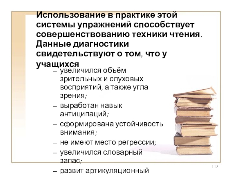 Слайд 117Использование в практике этой системы упражнений способствует совершенствованию техники чтения. Данные
