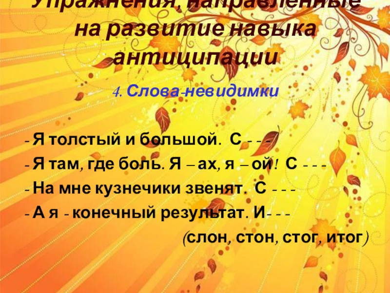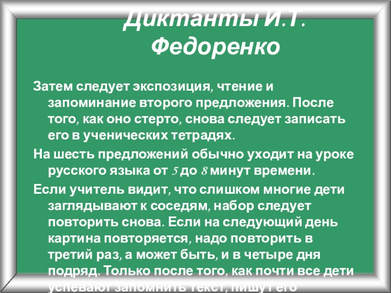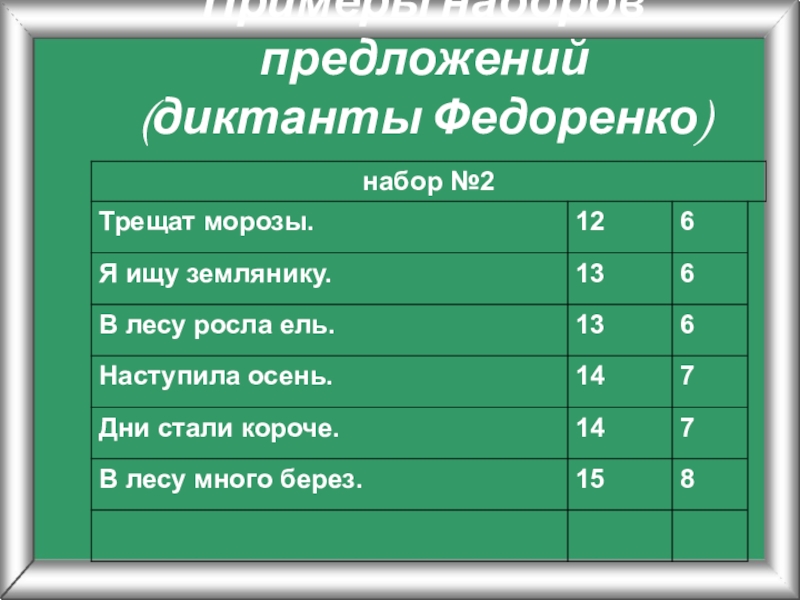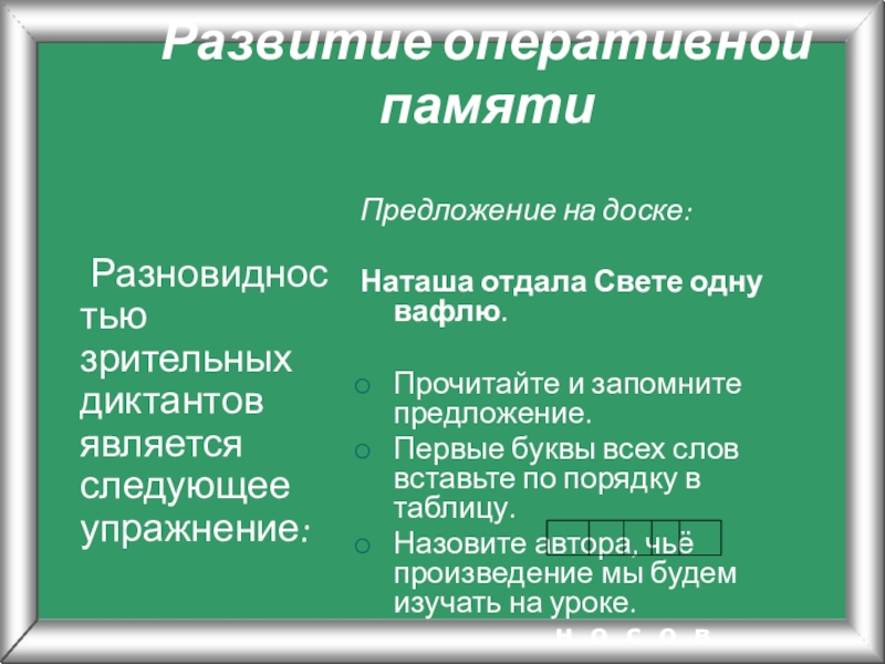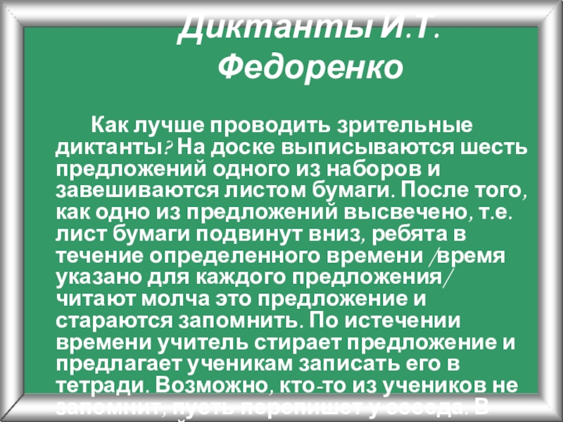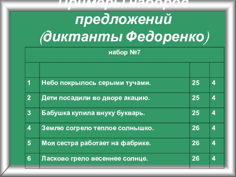 одного из наборов и завешиваются листом бумаги. После того, как одно из предложений высвечено, т.е. лист бумаги подвинут вниз, ребята в течение определенного времени /время указано для каждого предложения/ читают молча это предложение и стараются запомнить. По истечении времени учитель стирает предложение и предлагает ученикам записать его в тетради. Возможно, кто-то из учеников не запомнит, пусть перепишет у соседа. В следующий раз он постарается запомнить.