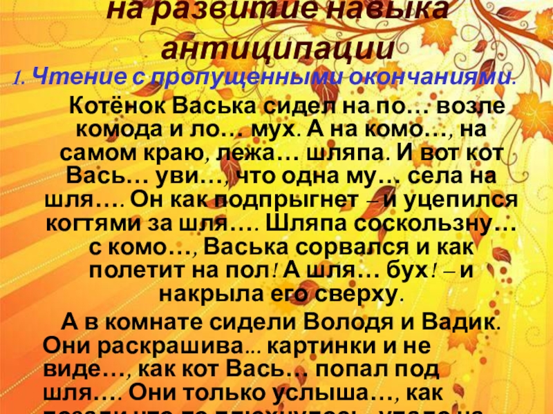 Часто можно наблюдать такую картину. Ребенок читает предложение, состоящее из 6-8 слов. Дочитав до третьего – четвертого слова – забыл первое слово. Поэтому он не может увязать все слова воедино. Необходимо в этом случае поработать над оперативной памятью.