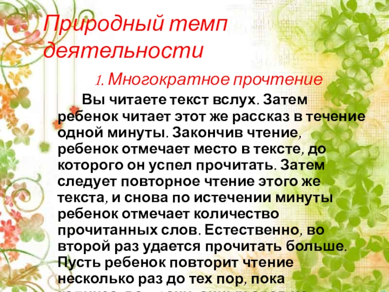 читает этот же рассказ в течение одной минуты. Закончив чтение, ребенок отмечает место в тексте, до которого он успел прочитать. Затем следует повторное чтение этого же текста, и снова по истечении минуты ребенок отмечает количество прочитанных слов. Естественно, во второй раз удается прочитать больше. Пусть ребенок повторит чтение несколько раз до тех пор, пока количество прочитанных слов не перестанет увеличиваться.