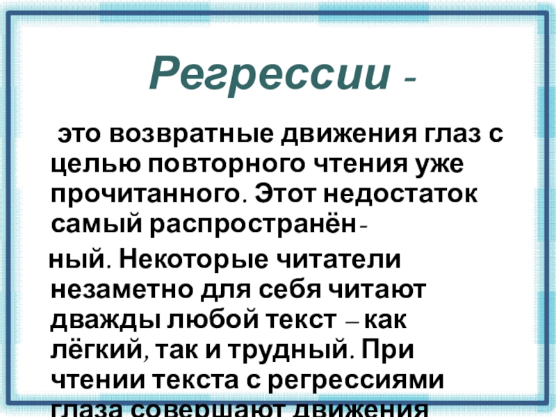 ный. Некоторые читатели незаметно для себя читают дважды любой текст – как лёгкий, так и трудный. При чтении текста с регрессиями глаза совершают движения назад, хотя никакой необходимости в этом нет.