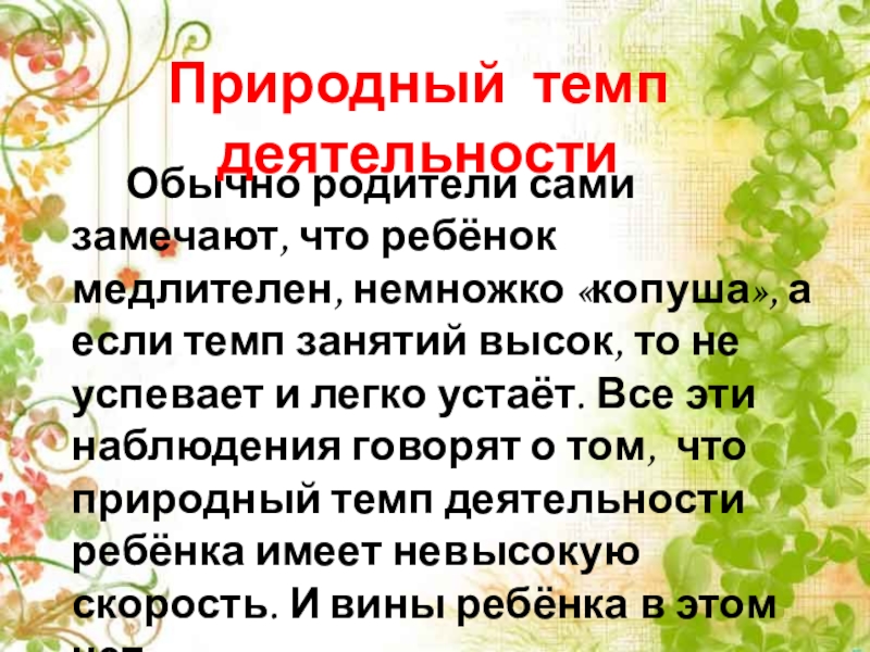 темп занятий высок, то не успевает и легко устаёт. Все эти наблюдения говорят о том, что природный темп деятельности ребёнка имеет невысокую скорость. И вины ребёнка в этом нет.