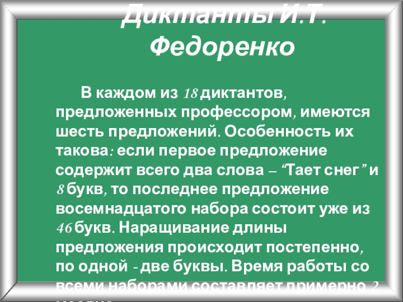 предложений. Особенность их такова: если первое предложение содержит всего два слова – “Тает снег” и 8 букв, то последнее предложение восемнадцатого набора состоит уже из 46 букв. Наращивание длины предложения происходит постепенно, по одной - две буквы. Время работы со всеми наборами составляет примерно 2 месяца.