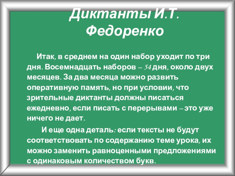 на один набор уходит по три дня. Восемнадцать наборов – 54 дня, около двух месяцев. За два месяца можно развить оперативную память, но при условии, что зрительные диктанты должны писаться ежедневно, если писать с перерывами – это уже ничего не дает.