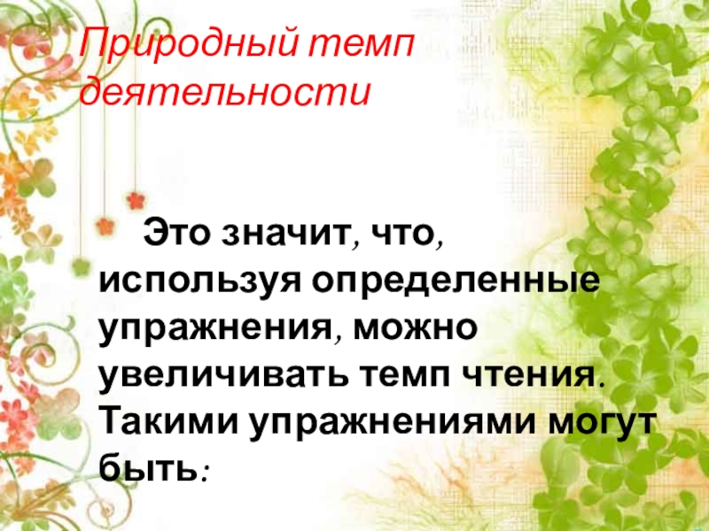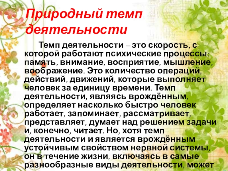 процессы: память, внимание, восприятие, мышление, воображение. Это количество операций, действий, движений, которые выполняет человек за единицу времени. Темп деятельности, являясь врождённым, определяет насколько быстро человек работает, запоминает, рассматривает, представляет, думает над решением задачи и, конечно, читает. Но, хотя темп деятельности и является врождённым устойчивым свойством нервной системы, он в течение жизни, включаясь в самые разнообразные виды деятельности, может постепенно изменяться.