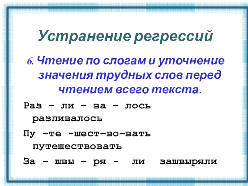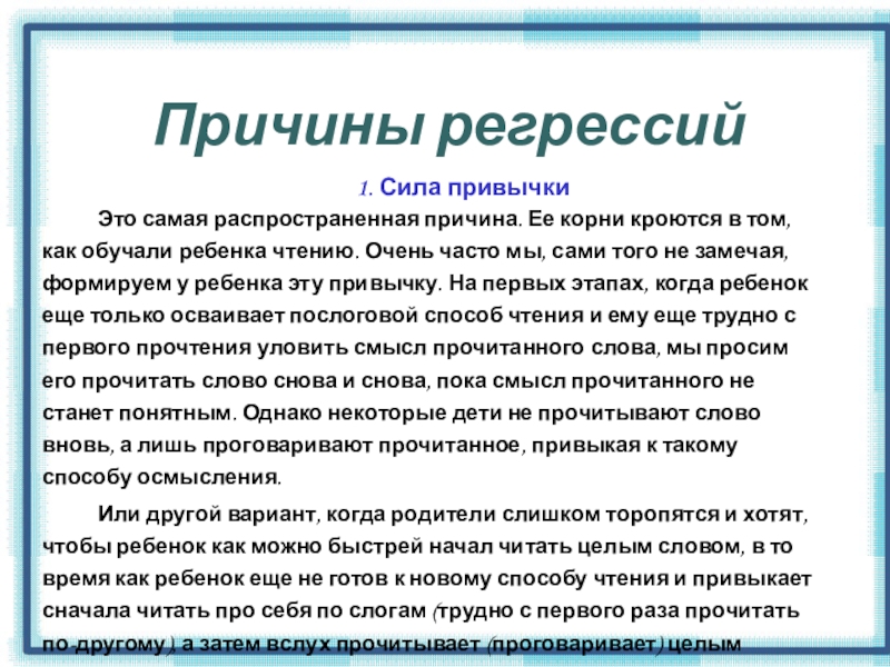 Или другой вариант, когда родители слишком торопятся и хотят, чтобы ребенок как можно быстрей начал читать целым словом, в то время как ребенок еще не готов к новому способу чтения и привыкает сначала читать про себя по слогам (трудно с первого раза прочитать по-другому), а затем вслух прочитывает (проговаривает) целым словом. И то и другое формирует привычку к регрессии. Кроме того, последний вариант способствует формированию привычки в дальнейшем всегда перечитывать длинные и трудные по написанию слова.