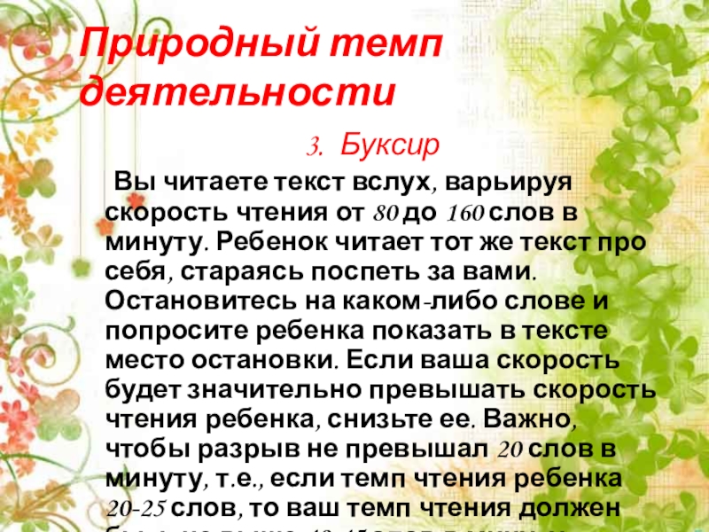 до 160 слов в минуту. Ребенок читает тот же текст про себя, стараясь поспеть за вами. Остановитесь на каком-либо слове и попросите ребенка показать в тексте место остановки. Если ваша скорость будет значительно превышать скорость чтения ребенка, снизьте ее. Важно, чтобы разрыв не превышал 20 слов в минуту, т.е., если темп чтения ребенка 20-25 слов, то ваш темп чтения должен быть не выше 40-45 слов в минуту.