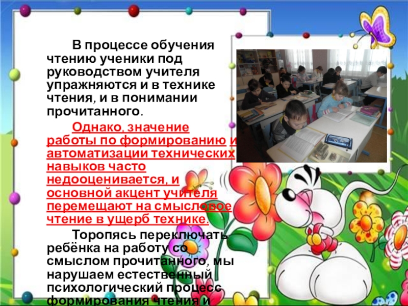 Однако, значение работы по формированию и автоматизации технических навыков часто недооценивается, и основной акцент учителя перемещают на смысловое чтение в ущерб технике.