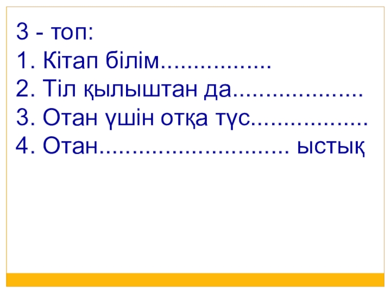 3 - топ: 1. Кітап білім................. 2. Тіл қылыштан да.................... 3. Отан үшін отқа түс.................. 4. Отан.............................