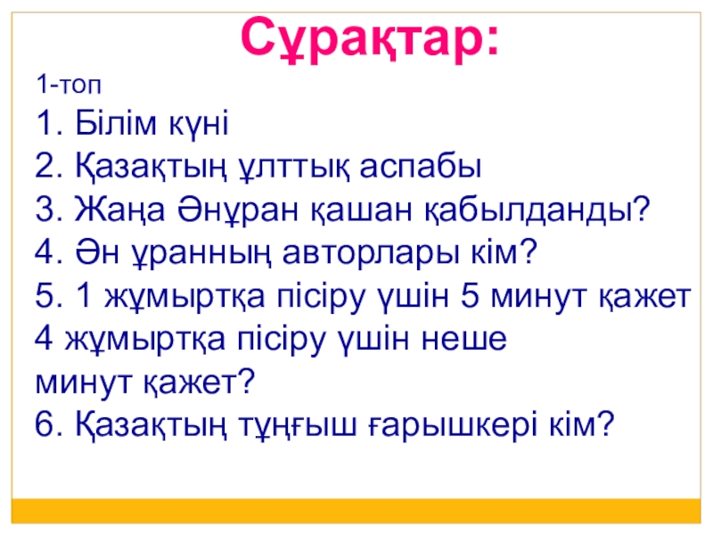 қашан қабылданды? 4. Ән ұранның авторлары кім? 5. 1 жұмыртқа пісіру үшін 5 минут қажет 4 жұмыртқа пісіру үшін неше минут қажет? 6. Қазақтың тұңғыш ғарышкері кім?