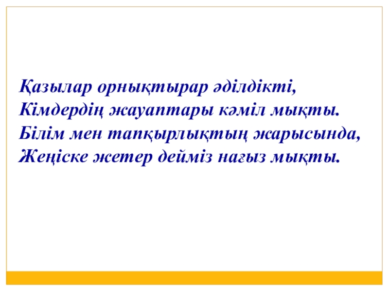 Слайд 21Қазылар орнықтырар әділдікті, Кімдердің жауаптары кәміл мықты. Білім мен тапқырлықтың жарысында, Жеңіске жетер дейміз