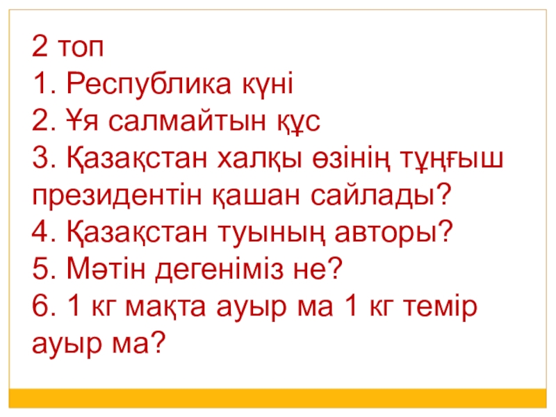 2 топ 1. Республика күні  2. Ұя салмайтын құс  3. Қазақстан халқы өзінің тұңғыш президентін