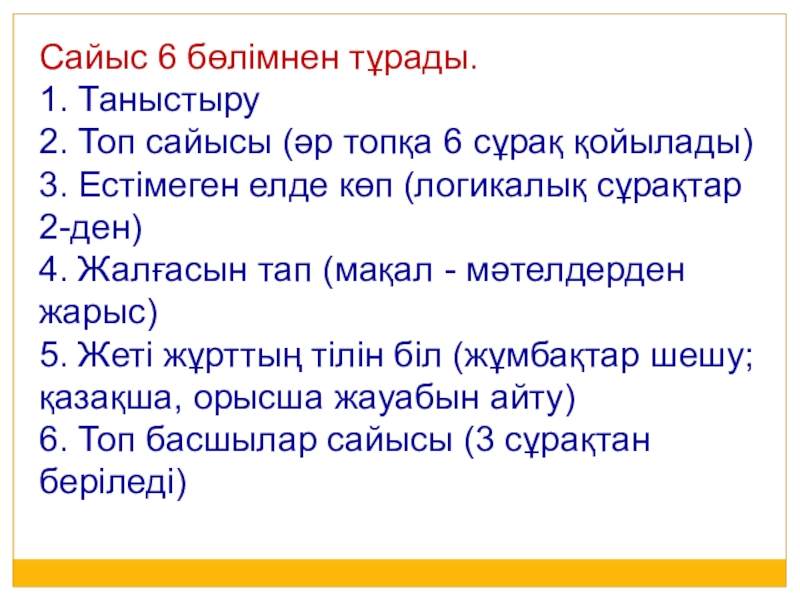 Слайд 3Сайыс 6 бөлімнен тұрады. 1. Таныстыру 2. Топ сайысы (әр топқа 6 сұрақ
