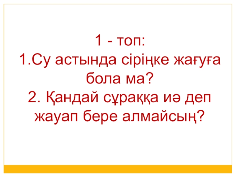 1 - топ: 1.Су астында сіріңке жағуға бола ма? 2. Қандай сұраққа иә деп жауап бере алмайсың?