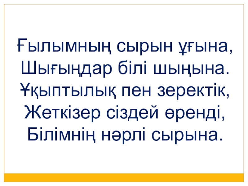 Слайд 4Ғылымның сырын ұғына, Шығыңдар білі шыңына. Ұқыптылық пен зеректік, Жеткізер сіздей өренді, Білімнің нәрлі сырына.