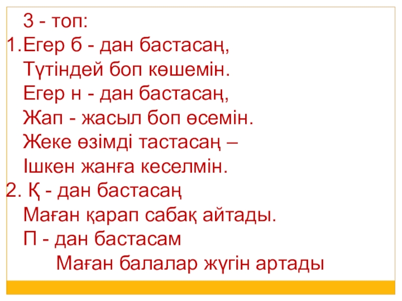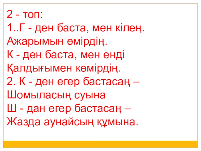 2 - топ:1..Г - ден баста, мен кілең. Ажарымын өмірдің. К - ден баста, мен енді Қалдығымен