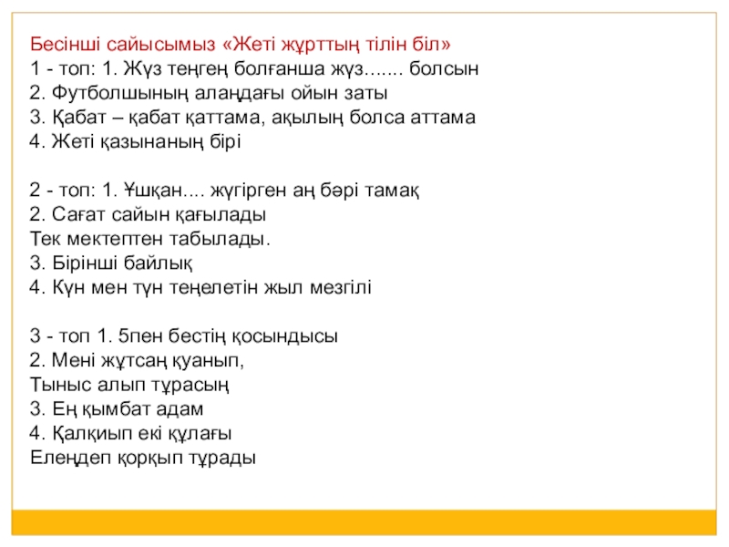Бесінші сайысымыз «Жеті жұрттың тілін біл» 1 - топ: 1. Жүз теңгең болғанша жүз....... болсын  2.