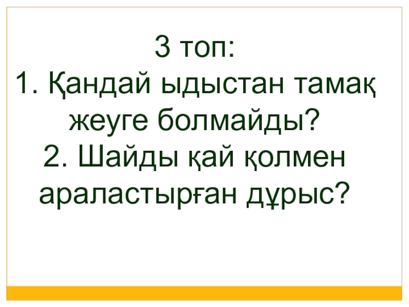3 топ: 1. Қандай ыдыстан тамақ жеуге болмайды?  2. Шайды қай қолмен араластырған дұрыс?