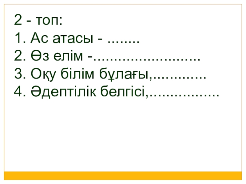 2 - топ: 1. Ас атасы - ........ 2. Өз елім -.......................... 3. Оқу білім бұлағы,.............