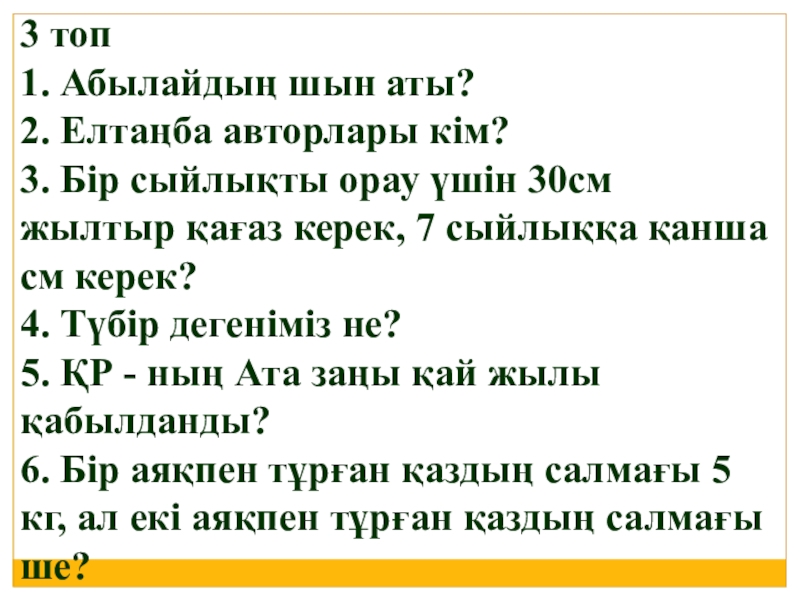 3 топ 1. Абылайдың шын аты? 2. Елтаңба авторлары кім?  3. Бір сыйлықты орау үшін 30см