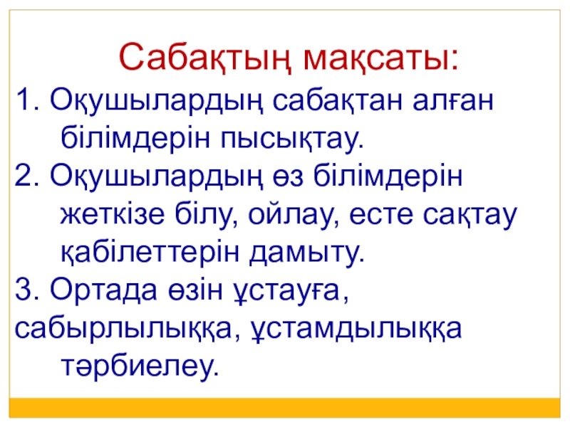 Сабақтың мақсаты: 1. Оқушылардың сабақтан алған білімдерін пысықтау.2. Оқушылардың өз білімдерін жеткізе білу, ойлау, есте сақтау қабілеттерін дамыту.3. Ортада өзін ұстауға,сабырлылыққа, ұстамдылыққа тәрбиелеу.