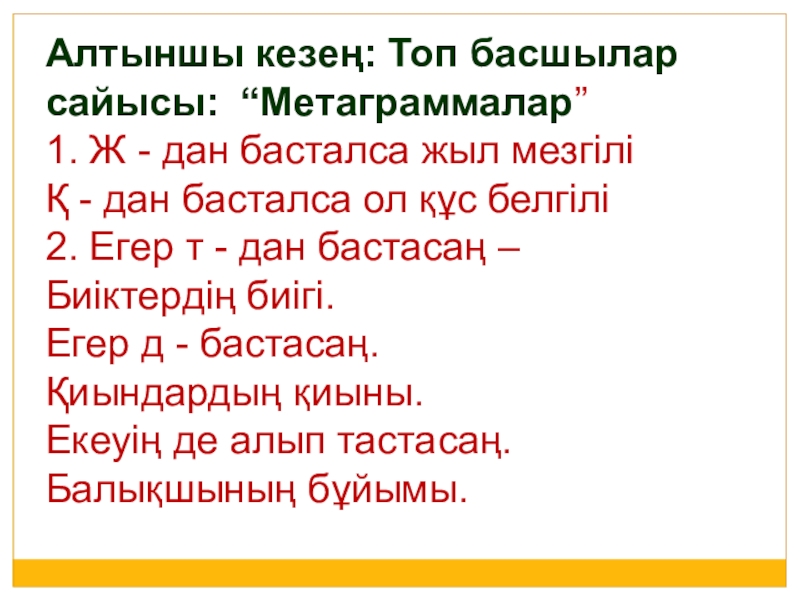 Слайд 18Алтыншы кезең: Топ басшылар сайысы: “Метаграммалар” 1. Ж - дан басталса жыл