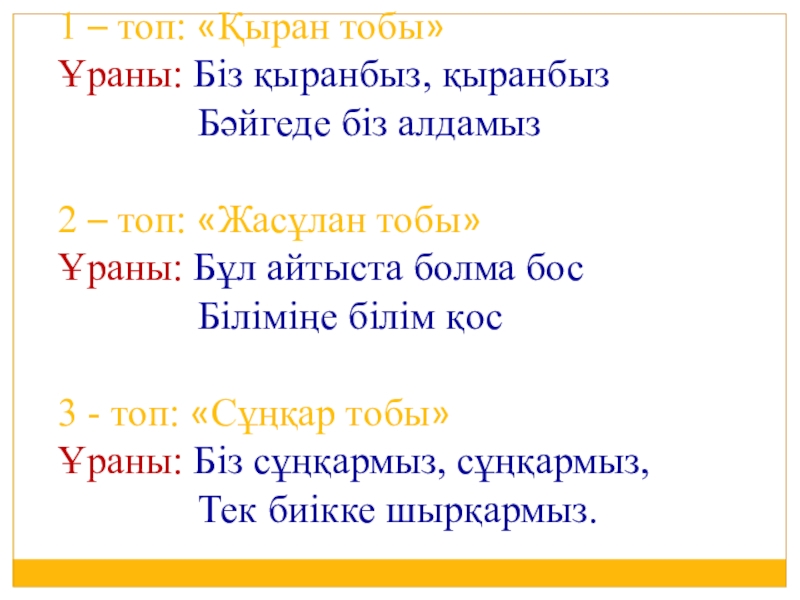 Бәйгеде біз алдамыз 2 – топ: «Жасұлан тобы» Ұраны: Бұл айтыста болма бос Біліміңе білім қос 3 - топ: «Сұңқар тобы» Ұраны: Біз сұңқармыз, сұңқармыз,